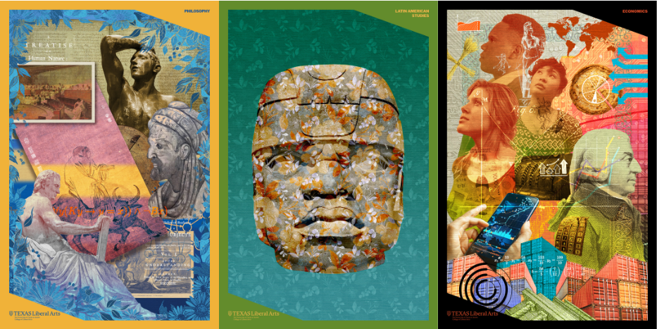 My projects are all different. I approached this particular project as a hybrid of design and art. I felt like the posters all had to fit a certain style, so I wanted to create a footprint, a pattern, where if you took off all the College of Liberal Arts branding, and you had two or three posters next to each other, you would think, “Oh, the same idea is at hand here.”